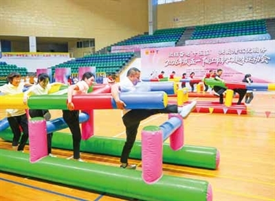 当天上午8时许,在体育馆主馆,来自全市各单位的20支队伍喊着口号,踏着整齐的步伐,陆续出场。热身运动后,各参赛队伍在极速先锋、合力建塔、鼓舞人心、移投致胜、妙笔生花等5大项目中,开展协作闯关,既比拼速度,又比拼合作能力。在极速先锋项目,记者看到,参赛人员分工合作,一同“钻”进一把“充气梯子”,然后,步调一致往前冲。现场不仅频频听到运动员的呐喊声,还有阵阵欢笑声。经过有趣又激烈的比拼,最终由市公安局机关工会委员会队、市卫生学校队和市城市管理和综合执法局机关工会委员会队获得职工趣味运动会一等奖。