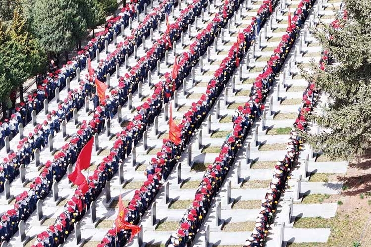 4月3日,参加徒步祭英烈活动的学生在任山河烈士陵园向烈士墓碑献花(无人机照片)。